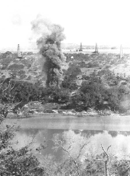 1920 Breckenridge Archive Photograph. Part of a set of pictures of a burning rig. The quiet cool water in the river is a tranquil contrast to the uncontrolable fire.