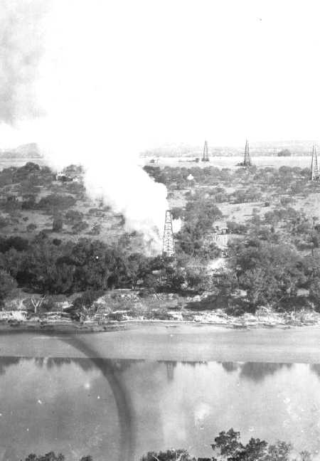 1920 Breckenridge Archive Photograph. Part of a set of pictures of a burning rig. The quiet cool water in the river is a tranquil contrast to the uncontrolable fire.